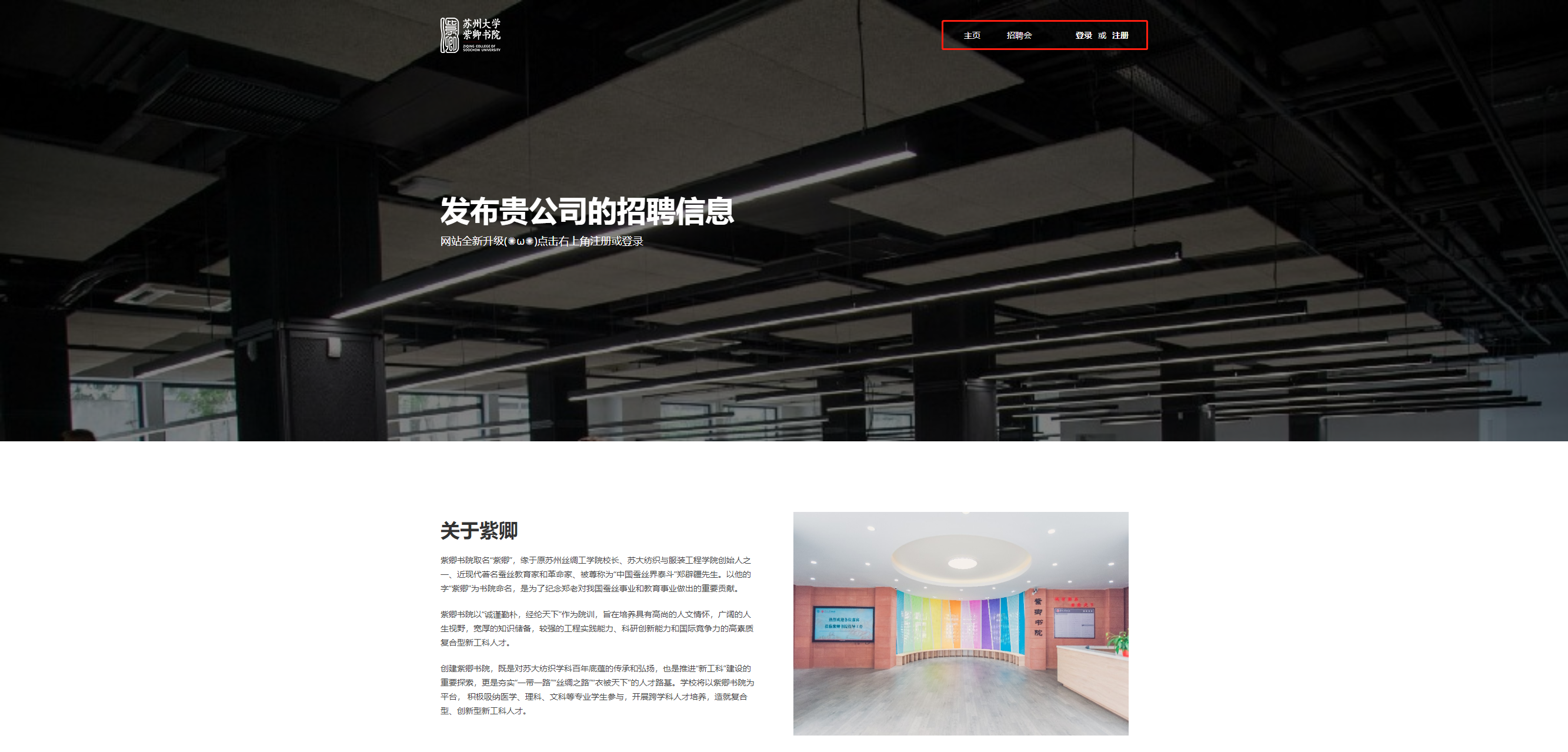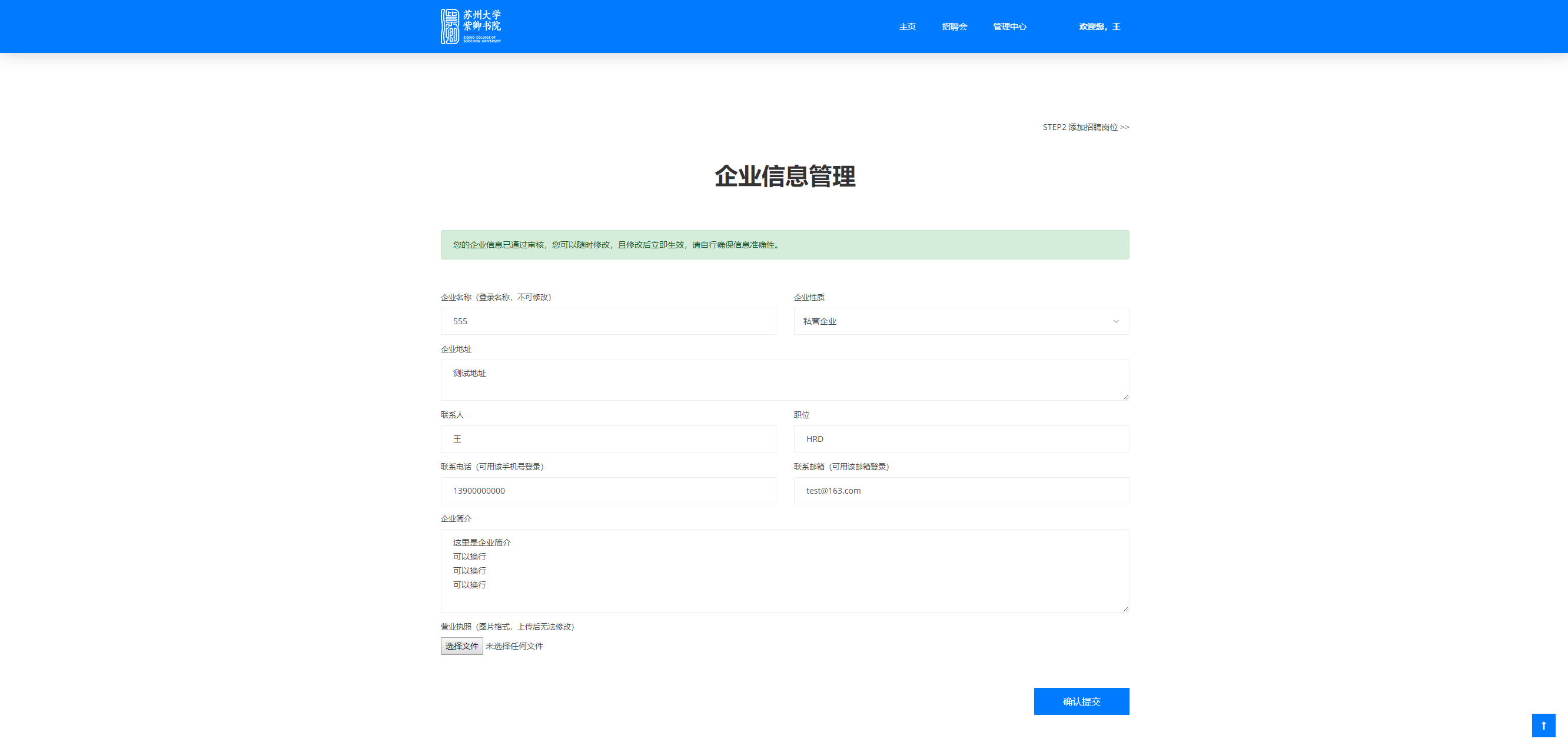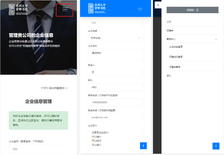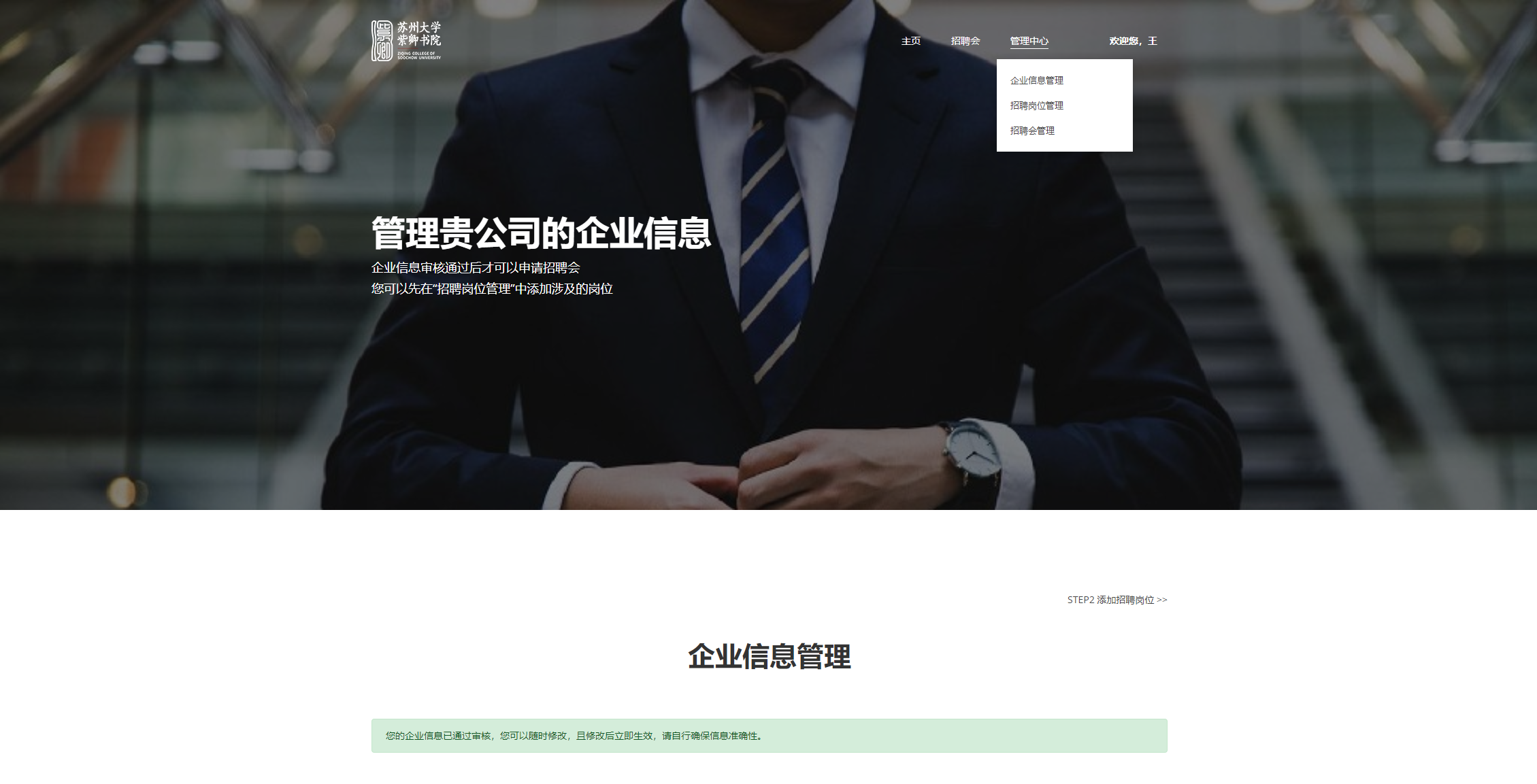 在“管理中心”一栏(登陆后会出现),可以快速导航企业信息、招聘岗位、招聘会申请三个页面。