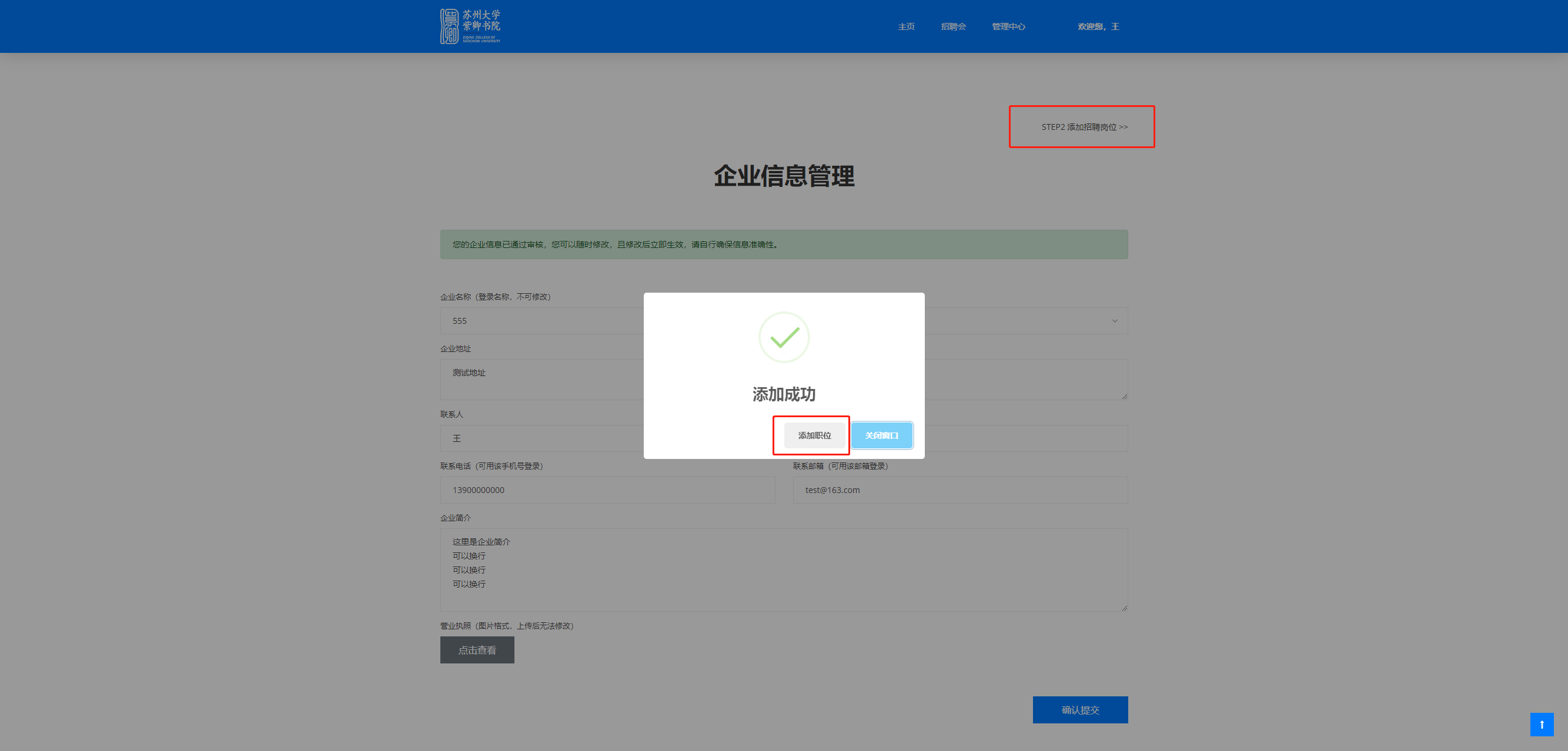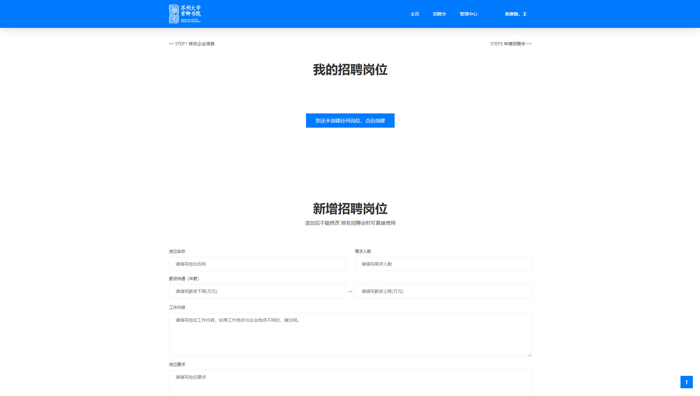 您可以点击提示框的“添加职位”按钮,或者页面右上端的“STEP2添加招聘岗位”前往添加招聘岗位。