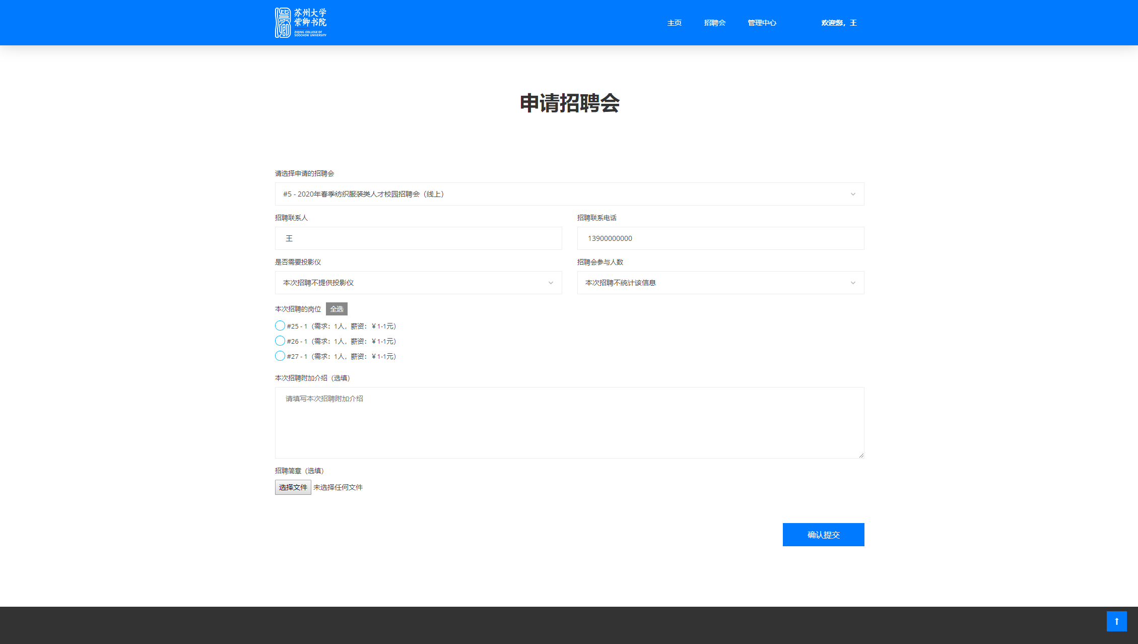 您需要在这里选择申请的招聘会,然后填写相关信息。招聘联系人和联系电话将使用企业信息中的联系人信息自动填充,线上场次招聘会不需要选择投影仪和参与人数。