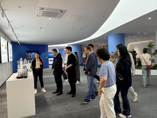 首先,集体参观学习了浙江省现代纺织技术创新中心。浙江省现代纺织技术创新中心作为浙江理工大学“三校区一中心”的重要组成,围绕先进纤维材料和绿色纺织染整两大主攻方向,开展关键技术攻关、成果转移转化、人才培养集聚和综合服务,促进纺织产业转型升级和新质生产力发展。在参观过程中双方就产教融合、行业发展等进行沟通交流,在创新中心展厅,看到一根丝在太空、航海、医疗、国防等领域实现的产业化应用,也让党员同志们切实感受到了纺织材料“上天下海入人体”的无限未来。