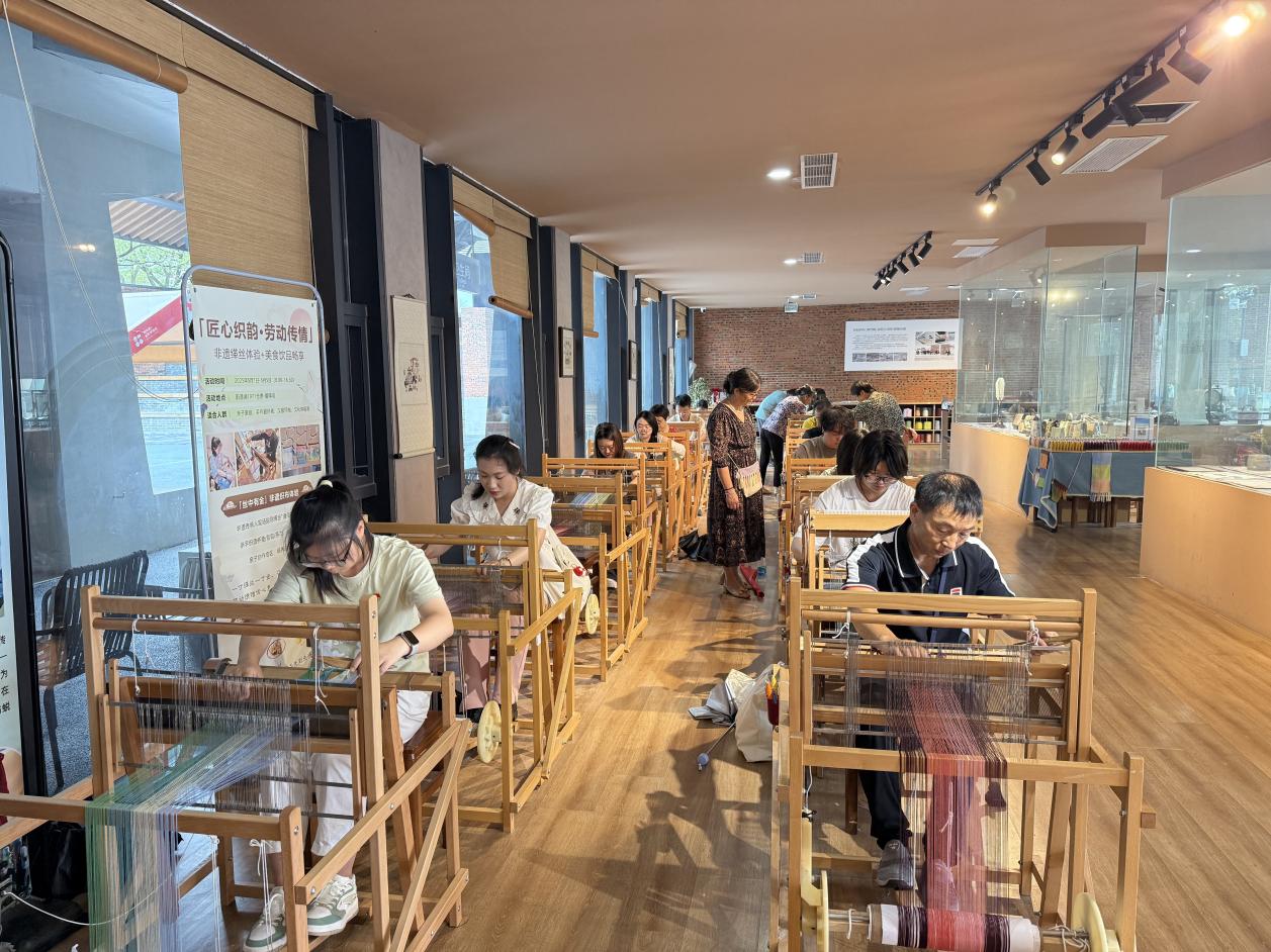在专业老师的指导下,党员们还体验了缂丝、扎染等传统手工艺。大家亲手操作织布机,穿梭的梭子、交织的经纬,在实践中感受缂丝制作技艺的精妙。图案设计定位、折叠、捆扎、点缀、夹……在扎染体验环节,党员们通过各种形式的组合,设计扎染T恤衫。看似无序的捆扎,带来的却是创作的惊喜。