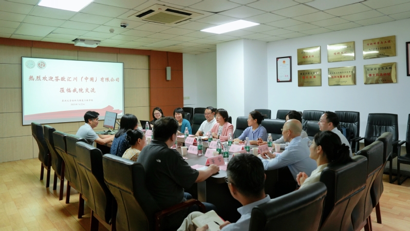 胡蓉晖详细介绍了企业历史沿革、发展定位及公司业务优势,随后与会人员围绕产学研深度融合与人才培养展开热烈讨论。双方就环保新材料研发、传统工艺替代、生物基产品应用、分析检测及标准制定等议题交换意见。陆晓峰就人才需求和合作方向作了展望。