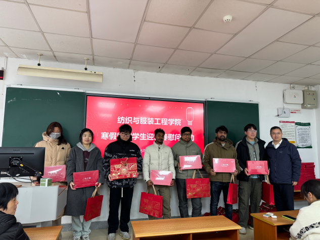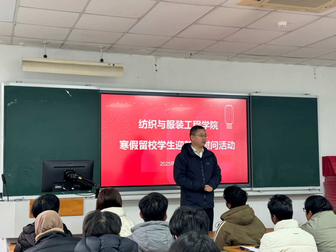 在新春佳节即将到来之际,2025年1月23日上午,中国三级片 在独墅湖校区开展寒假留校学生迎新春慰问活动,学院党委书记肖甫青,党委副书记、副院长虞岚,现代丝绸国家工程实验室副主任刘欣亮为留校学生送上新春祝福及春节礼物。