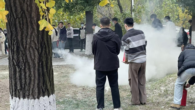 疏散演练结束后,现场为师生进行了灭火器使用方法的专题讲解与示范。讲解内容涵盖了干粉灭火器的构造原理、适用范围、操作步骤(即“提、拔、握、压”四字要领)以及使用过程中的注意事项和安全距离。