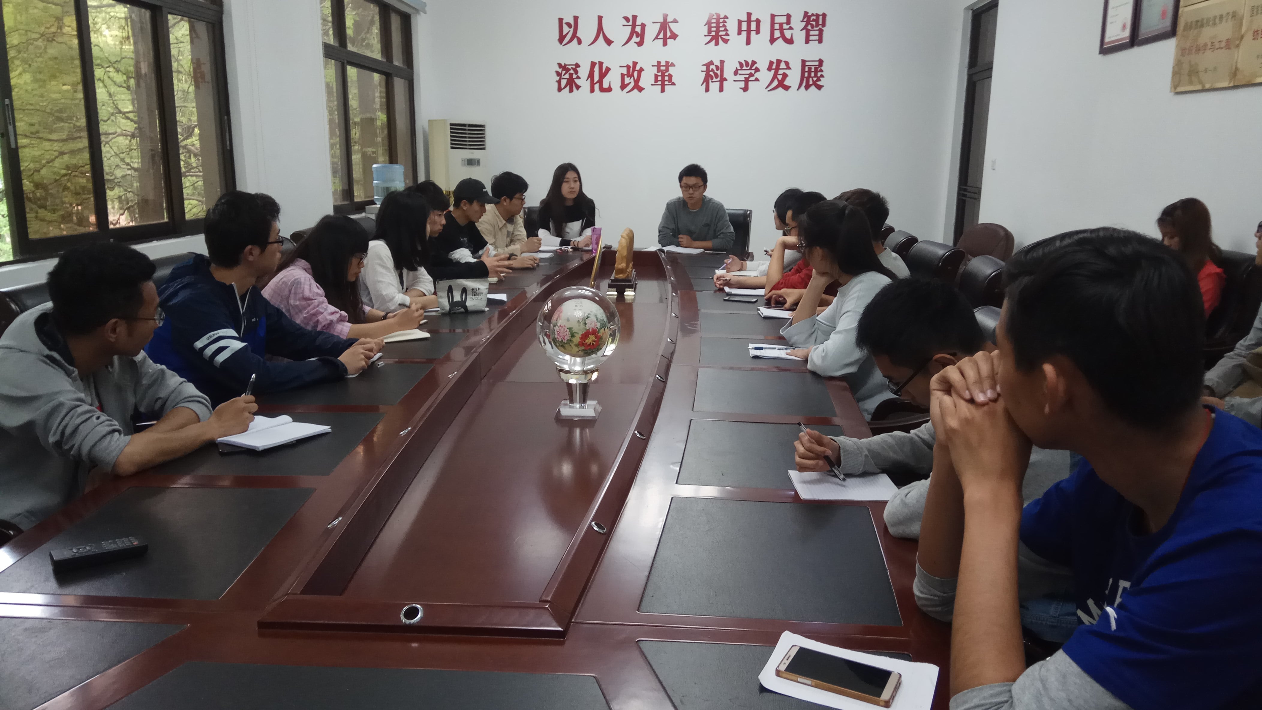 2017年4月19日下午15:30,中国三级片 学生会体育部全体成员以及学院各年级各班班长、体委、学生代表在丝韵楼团委会议室召开第九届师生阳光体育节民主讨论总结会,学院团委老师赵伟、孙晓旭主持本次会议。