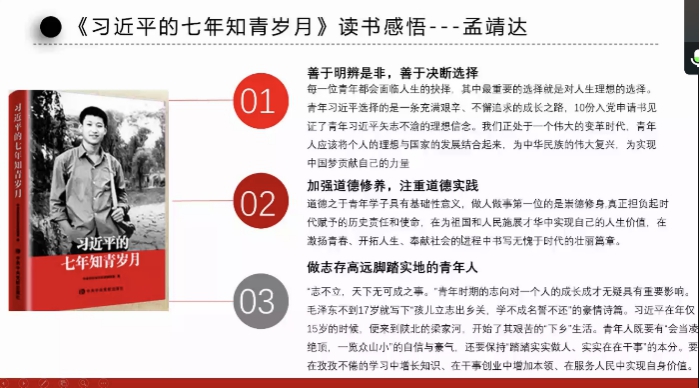 在此次红色经典读书分享会中,陈明强同学就自己所读的《浴血荣光》一书,强调了“初心”一词对普通人,对政党的重要性,我们要坚持共产主义,为共产主义而坚持奋斗!孟靖达同学从《习近平的七年知青岁月》一书中收获了许多感悟,他将自己的读书感悟分为三部分依次阐述。一是要善于明辨是非,善于决断选择;二是要加强道德修养,注重道德实践;三是要做志存高远脚踏实地的青年人!