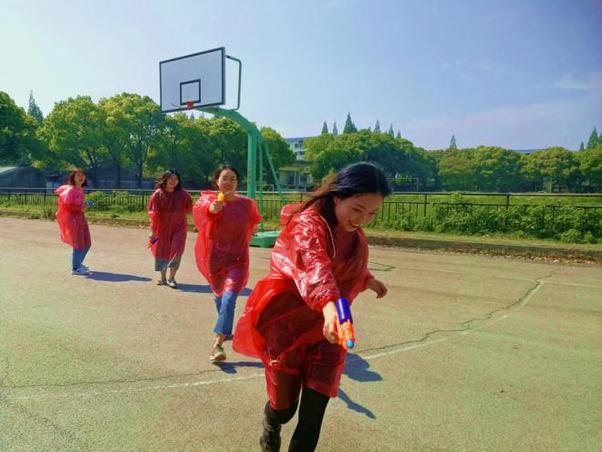 最后一个环节是"领土"保卫战,游戏通过水枪战模拟了五四运动的保卫山东主权抗争事件。所有人先以水桶为中心手牵手围成一个大圈,团支书说开始后同学们可以开始向中间跑,为水枪加水。每组同学通过团队配合进行团队水枪大战,最后根据地图被打湿的程度为每个组加分。这个环节相当耗费体力,加上中午些许炎热的天气,同学们也面临着一定的挑战。但合作精神让每个团队都产生了不同的战术,有严谨防守型的,也有主动进攻型的,但都免不了一场水枪大战。同学们在操场上奔跑“交战”,好像一瞬间回到了那些无忧无虑的快乐日子。我们热闹的游戏气氛也同样吸引了保安叔叔的目光。游戏接近尾声,同学们都有些疲惫,但还是试图发起最后的进攻。随着游戏结束的信号发出,各队将自己的拼图放在地上,交由主持人评分。