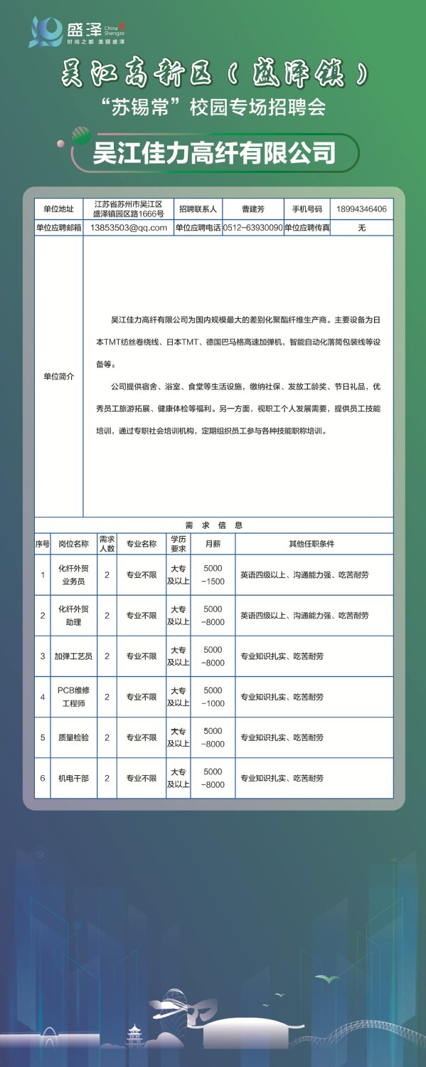 【招聘信息】吴江佳力高纤有限公司