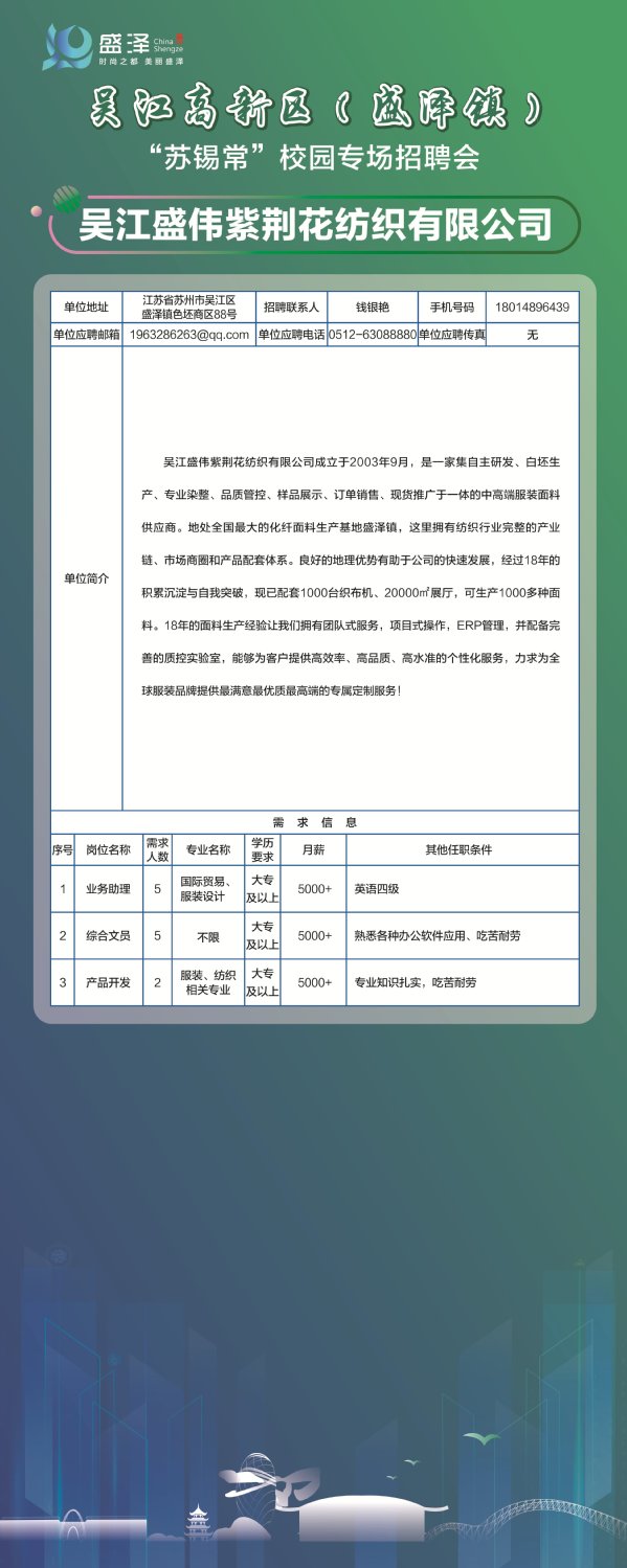 【招聘信息】吴江盛伟紫荆花纺织有限公司